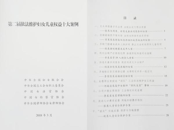 为贯彻落实中央关于全面依法治国的重要部署,全国妇联与相关团体会员联合发起了“依法维护妇女儿童权益十大案例”征集评选活动,并于2015年12月4日“国家宪法日”向社会发布了第一届“十大案例”,在国内国际引起反响。2017年,全国妇联继续联合团体会员,开展“十大案例”的征集评选活动。通过各地初评和系统推荐,从近两年办理的大量案件中推选出72个在权益类别上具有典型性、在维权方式方法上具有可借鉴性的案例进入终评,评审组经过查阅卷宗、核实内容、评议投票等环节,推选出20个入围案例,在综合考虑案例对于解决同类案件和重点难点问题的指导意义的基础上,最终评选出最具代表性的本届“十大案例”。