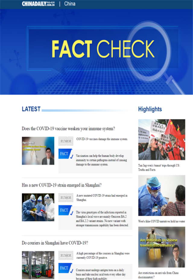 承担主流媒体应有的社会责任,科学、依法、建设性地开展舆论监督。在中国日报网设置新闻和举报热线,对民众关注的热点问题进行监督报道,“照谣镜”栏目对各类谣言或不科学言论及时予以澄清或反驳。调查性报道《观察:医院应对新型冠状病毒感染激增》,实地探访中日友好医院发热门诊,还原事实真相,助力科学防疫。