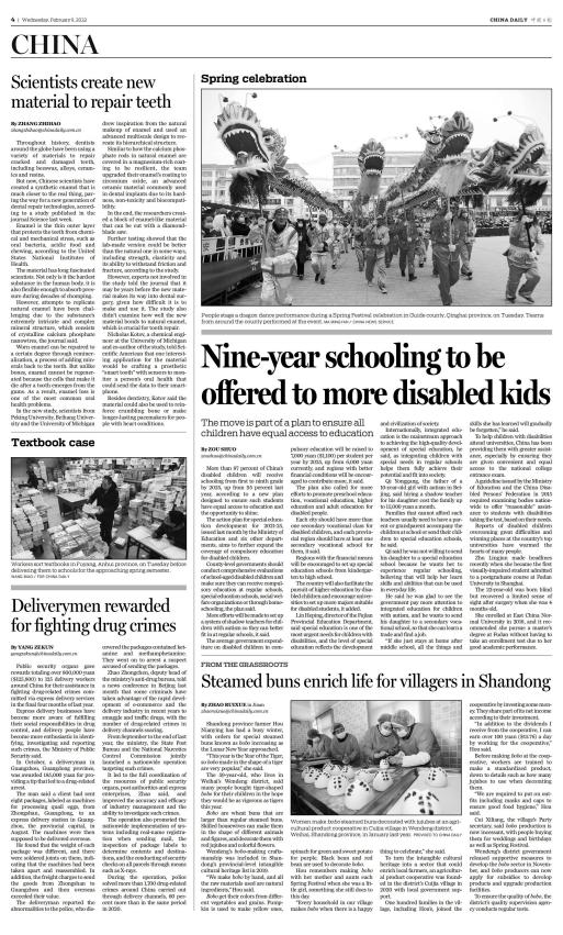 2月9日《中国日报》第4版,刊发报道《更多残疾儿童将获得九年义务教育》