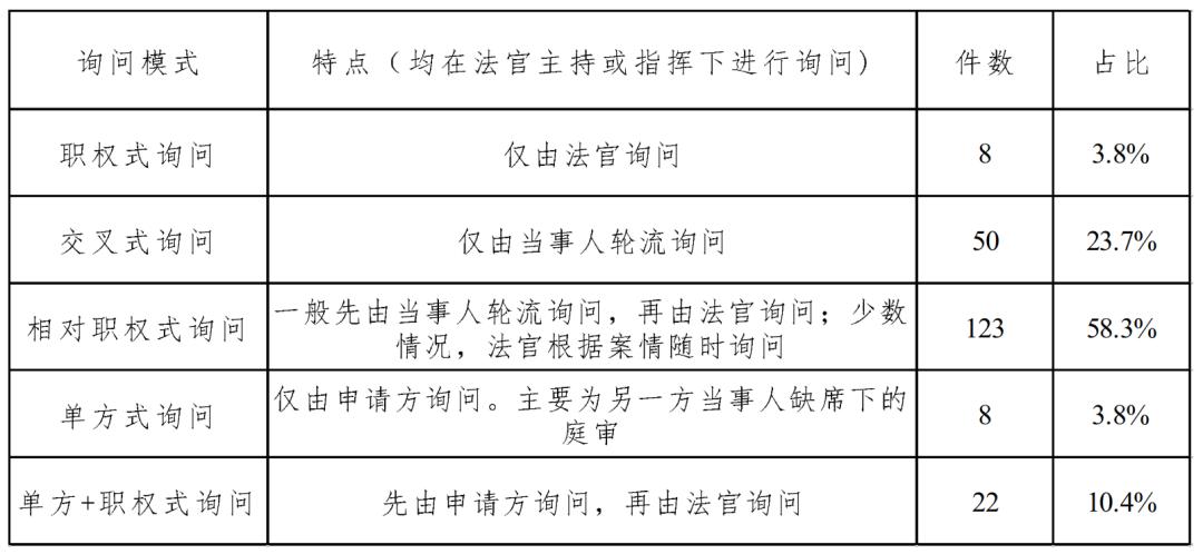 依据询问主体的不同,将询问证人划分为下表2所示五种模式。采用相对职权式询问的案件123件,占58.3%,采用交叉式询问的案件50件,占23.7%,两种询问模式占82%。总体来看,法官在程序上体现出中立性,未明显偏向一方当事人,各方在其主持或引导下询问证人。需要指出,相对职权式询问模式既不同于英美式的交叉式询问,也不同于大陆法系的职权式询问,而是具有鲜明的中国特色。