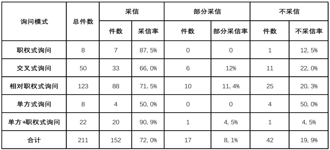 分析发现,仅有举证人到庭的缺席审判是职权式、单方式、单方+职权式询问模式出现的主要原因。211件证人出庭案件中,35件为被告未到庭的缺席审理案件。