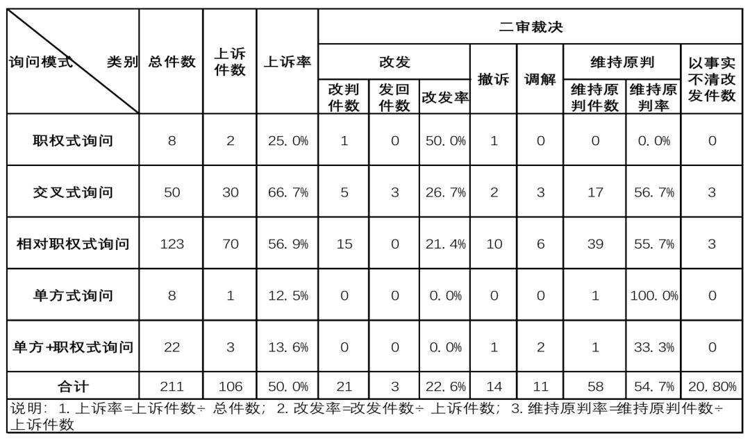 分析得出两种较优(理性)询问模式:(1)当事人双方都到庭,具备交叉询问基础,此情形下相对职权式询问模式最优,该模式在程序设计上更加平衡自恰,是查明案件事实的较优装置。理由在于:一是该模式下一审证言的采信率为71.5%(表3),高于交叉式询问模式。采用该模式的123件案件中,有70件上诉,上诉率为56.9%,低于交叉式询问。二是采用该模式的二审改发率为21.4%(表4),比采用交叉式询问低5.3%,二审以事实不清为由改发的案件比例也低于交叉式询问的比例。申言之,采用该模式审理的案件更经得起二审考验。(2)单方+职权式询问模式最优理由。因一方当事人均未到庭,不具备交叉询问基础,询问模式可适用职权式、单方式和单方+职权式。表3、表4显示,单方+职权式询问案件的一审采信率90.9%为最高,13.6%的上诉率相对较低,故该模式是缺席审理下的较优询问模式。单方式询问虽上诉率较低,但因既无对抗性询问又无法官职权询问,不利于全面准确查明案件事实,故不建议采用。