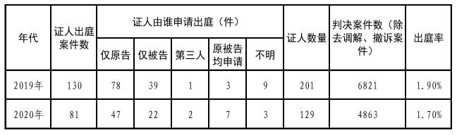 1.证人出庭率低。J区法院2019年民事判决案件6821件,证人出庭案件130件,出庭率为1.9%;2020年民事判决案件4863件,证人出庭案件81件,出庭率为1.7%。2020年证人出庭率略低于2019年,主要是受新冠疫情影响。