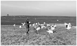 12月初的黑龙江扎龙国家级自然保护区,地面上覆盖着积雪,成片芦苇在风中摇曳。伴随着训飞员的旗帜与口令,成群的丹顶鹤从山坡上迎风飞起,在空中飞舞盘旋后,优雅地落到黄色芦苇地上。