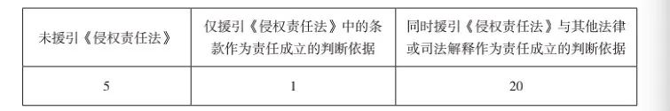 第五,这一论断与我国司法实践的经验和做法不合。梁慧星教授认为,法官在针对某一诉讼请求的判决中,援引多个条文确定责任,将“增加法官工作量”“浪费司法资源”“增加司法风险”,“全国 10 万民事法官”不会答应。那么我国司法实践的现状究竟是怎样的呢?以梁慧星教授所使用的《侵权责任法》的判决为例,笔者在北大法宝数据库中,检索《侵权责任法》实施以来的,以侵权责任纠纷为案由的最高人民法院公报案例共 26 个。对这 26 个案件中法院确定侵权责任成立时所援引的规范进行总结,可以得出如下数据: