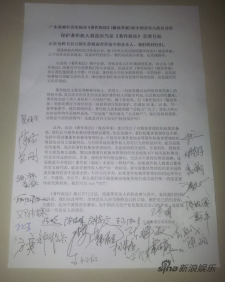 《著作权法》修订开门立法,使我等音乐人有机会参与其中,表达我们的利益诉求。我们在此呼吁:全体音乐人应当坚持自己的立场,维护自己的生存权,为我们,也为中国的音乐事业,为中国的文化产业发展发出自己的声音。这是我们这一代音乐人的责任。