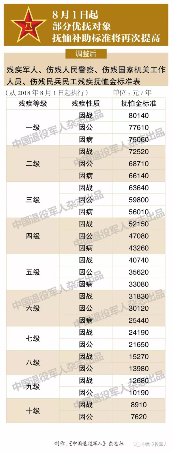 调整后,一级因战、因公、因病残疾军人抚恤金标准为每人每年80140元、77610 元、75060元,分别比2017年提高了7290元、7060元、6820元。