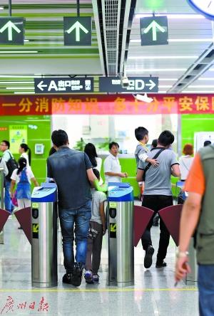 家长带着儿童进地铁闸口。