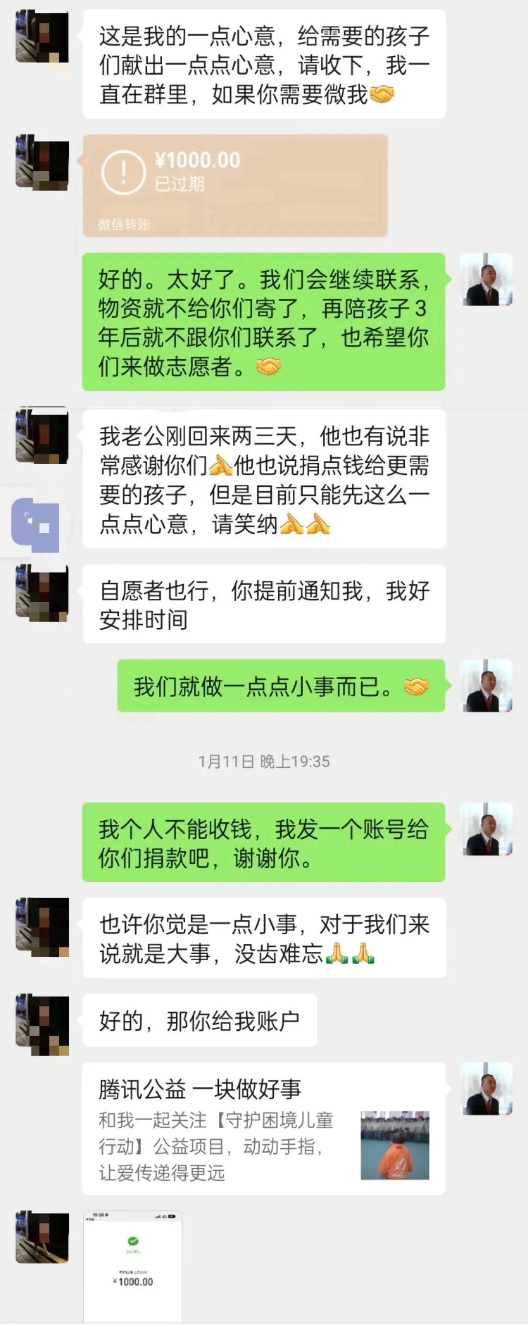同时,她也表达了对红苹果公益志愿者的敬意和邀请。她说:“我们一直在群里,如果您需要微我。我老公刚回来两三天,他说非常感谢你们。他说要捐点钱给更需要的孩子,但是目前只能有这点能力就这么一点点心意,请笑纳。假如需要我就做志愿者,请您提前通知我,我安排时间一定来。我们就只能做一点点小事而已。”这份谦逊和真诚让我们深感感动。她用自己的实际行动诠释了什么叫做“感恩”,什么叫做“回馈”。