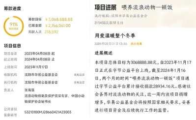 截至2月2日,由中国小动物保护协会秘书长张海强为责任人的“喂养流浪动物一顿饭”项目共吸引20余万人捐款,获得筹款金额276万余元。从1月16日至2月2日,该项目共筹集273万余元。