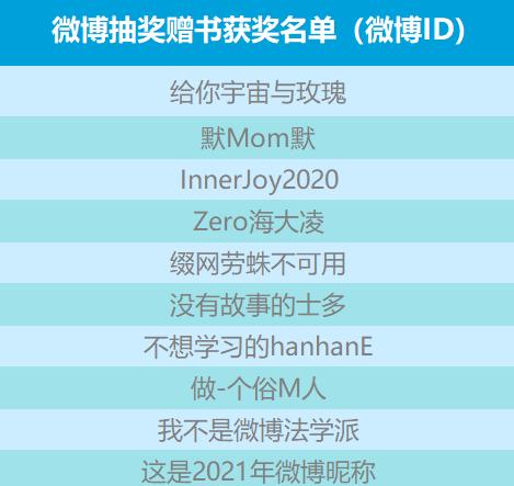 2021年2月2日—2月9日上海市法学会官方微博开展了抽奖活动,奖品为:中国知网数据查询卡10份(面值300元/份)。现将经平台审核通过的获奖名单(微博ID)公布如下: