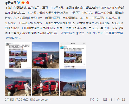 【你们在洱海边洗车的样子,真丑…】2月7日,有网友爆料称一辆车牌为“川J95XXX”的红色轿车在洱海边洗车、洗衣服。爆料人杨先生告诉记者,7日下午3点左右,杨先生的父母在洱海边散步,在小关邑出来大约2km,葭蓬村不到一点的洱海边,有一红一白两车正在洗车洗衣服,红车洗完,白车还没来得及洗,被杨先生父母及时制止。记者从大理州公安局获悉,警方在接到报警的第一时间和大理州环保部门进行协商,共同寻找该车辆,目前正在追寻中。根据《洱海保护条例》该车将面临相应的行政处罚。