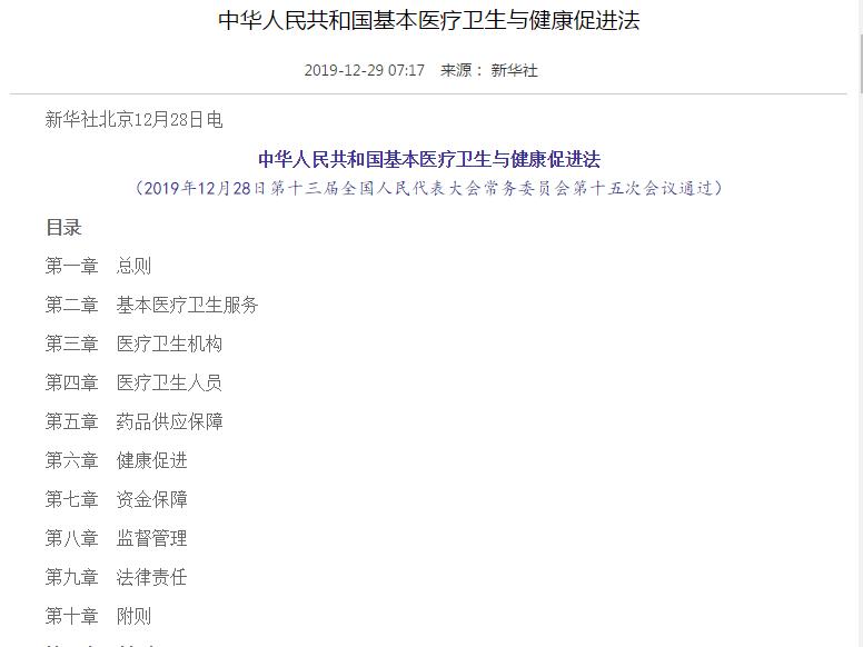 《中华人民共和国基本医疗卫生与健康促进法》(以下简称《基本医疗卫生与健康促进法》)已于2019年12月28日由第十三届全国人民代表大会常务委员会第十五次会议审议通过,自2020年6月1日起施行。这是我国卫生与健康领域第一部基础性、综合性的法律,人民的健康权利从此有了立法保障。《基本医疗卫生与健康促进法》共分十章110条,涵盖基本医疗卫生服务、医疗卫生机构和人员、药品供应保障、健康促进、资金保障等方面内容,凸显“保基本、强基层、促健康”理念。