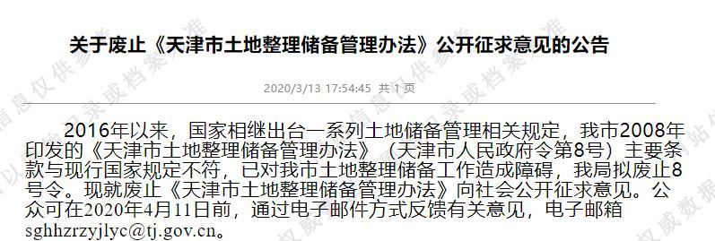日前,天津市规划和自然资源局发布公开征求意见公告,拟废止天津市2008年印发的《天津市土地整理储备管理办法》(天津市人民政府令第8号)。