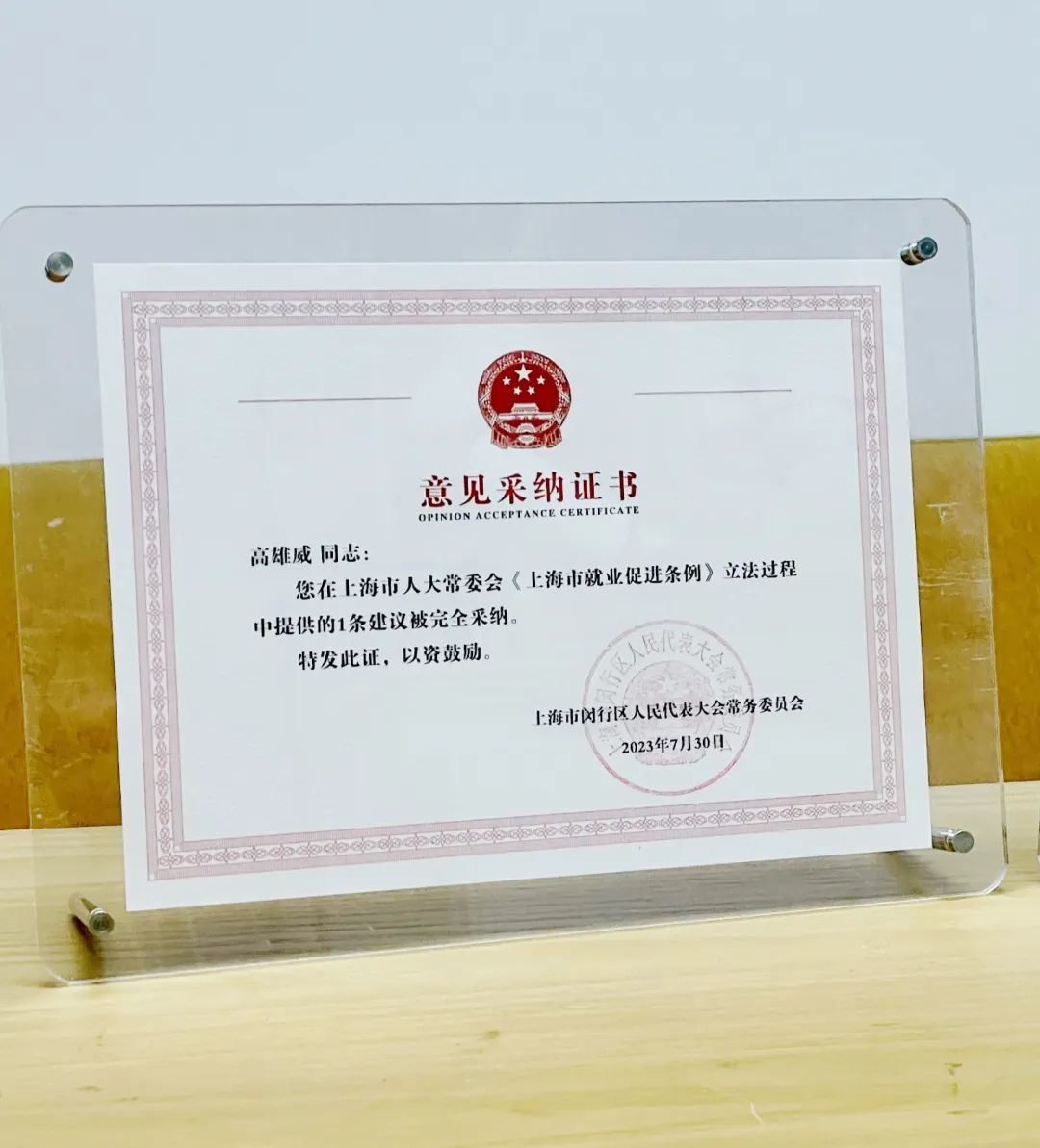“2022年11月底,我把建议提给了项目组的老师,2023年6月,老师通知我的建议被采纳了,同时闵行区人大常委会还给我发了一张证书。”高雄威开心地说,在《上海市就业促进条例》征询意见时,他们项目小组共有11位学生参与,提出10条建议,被采纳2条。“我们希望在这个通道中,为立法建议提出更多的有益建议。”