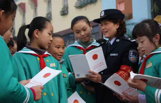 山东省枣庄市文化路派出所民警给小学生赠送《中华人民共和国未成年人保护法》单行本。摄影/ 吉喆
