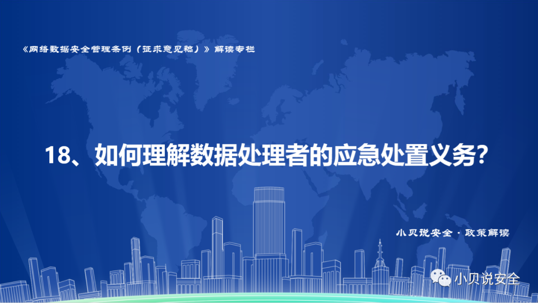 一是,该条分层次提出了数据安全应急处置要求。首先是规定了通用的一般要求,在此基础上规定了重要数据或者十万人以上个人信息安全事件的应急处置义务。有的人提出,为什么不把后者放到“重要数据安全”一章中呢?这不是不可以,但会带来理解上的不便。故《条例》还是将两者放在了同一条款之中。