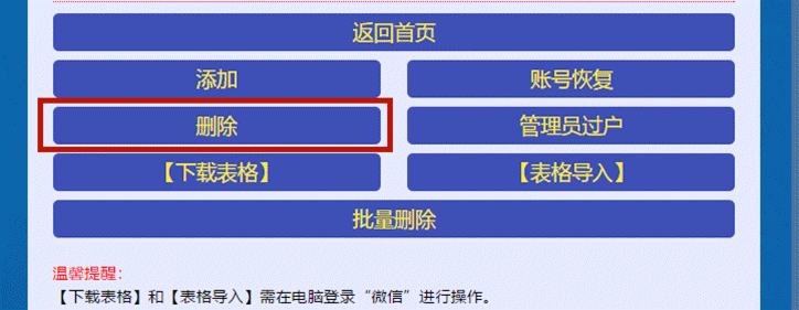 4.“删除”:删减毕业学生人员,可直接点击“删除”,输入需删减人员的“账号”,点击“确认”。(此功能需谨慎操作,删除后此学生考试数据将清空)