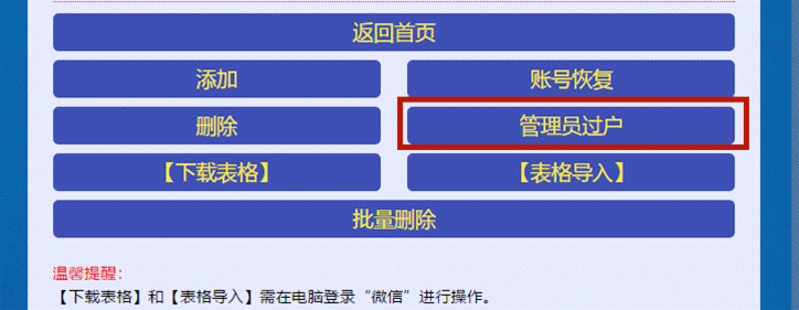 5.“管理员过户”:用于各单位管理员更换,旧管理员进入“管理中心”,点击“管理员过户”,输入新管理员账号(新管理员必须为本单位人员且已登录了学法系统),点击“确定”,即完成管理员过户。