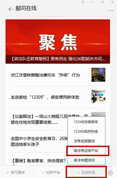 通过市普法办、市司法局官方微信公众号——“韶司在线”开设的“韶关市普法考试微平台”进行测试。