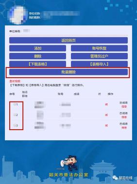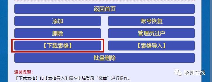 2.学生管理员(负责管理学生学考的教职工):登录个人微信,在“韶司在线”微信公众号右下角子栏目点击“互动栏目”——“普法考试微平台”进入“韶关市普法考试微平台”,点击“管理员入口”,输入“学校所在地”(本学校地址所属区域,如广东北江中学地址属“武江区”)、“管理员手机号码”和“学校人数”(以报送市普法办的学生管理员和在校学生数据为准)登录平台首页,只能是学生管理员自己微信登录,其他人员微信登录无效,点击“下载表格”输入本学校学生信息后“导入表格”,按序号分配到各班级,各班班主任再下发本班学生的账号(包括学校统一的编号)给学生登录使用。学生管理员应及时将本校2020年毕业学生的学法账号删除,2021年即将毕业学生不需删除,继续参加考试。原年级应修改为新升年级名称。(可批量删除和批量升年级)