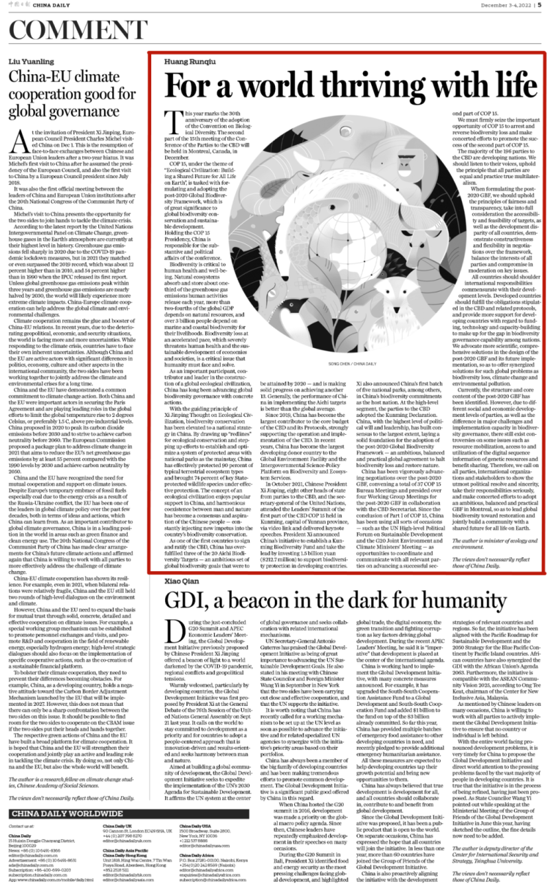 联合国生物多样性大会(COP15)主席、生态环境部部长黄润秋在《中国日报》发表署名文章