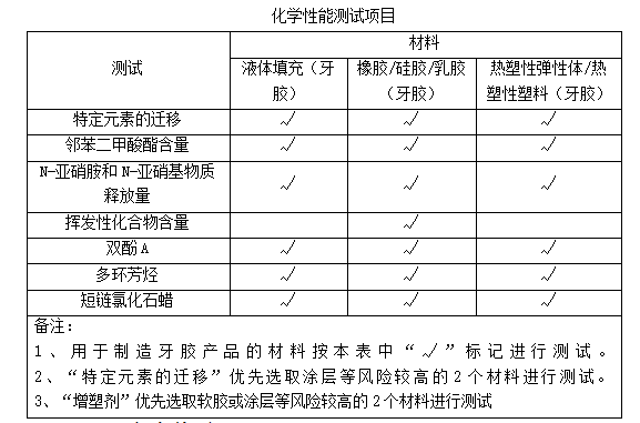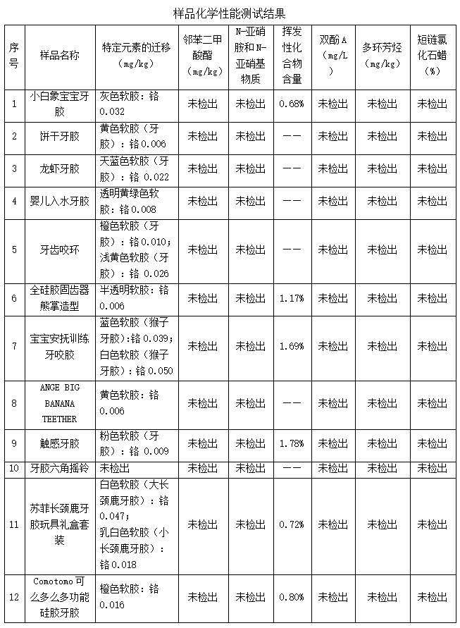 为评估牙胶样品的材料安全性,本次比较试验参照GB28482-2012《婴幼儿安抚奶嘴安全要求》等标准对样品进行相关的有害物质的测试。测试结果见下表。