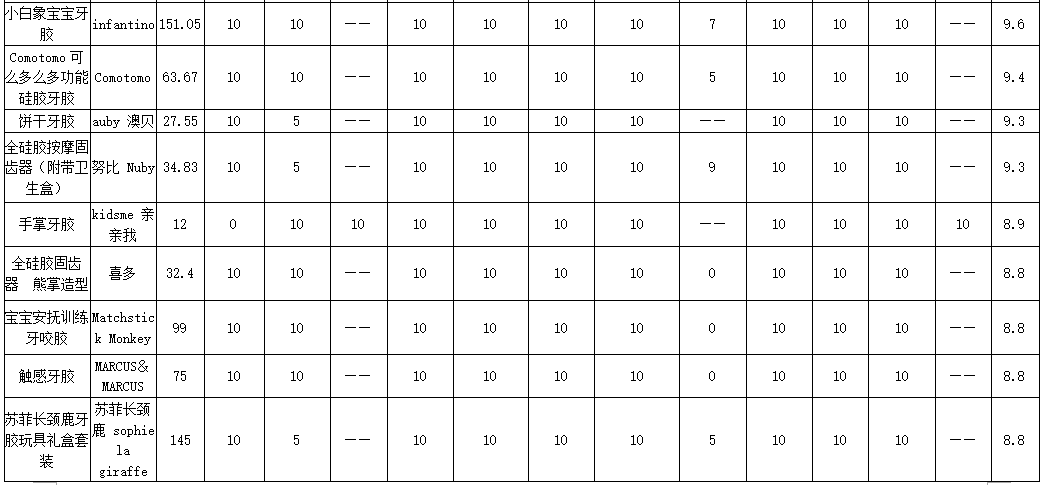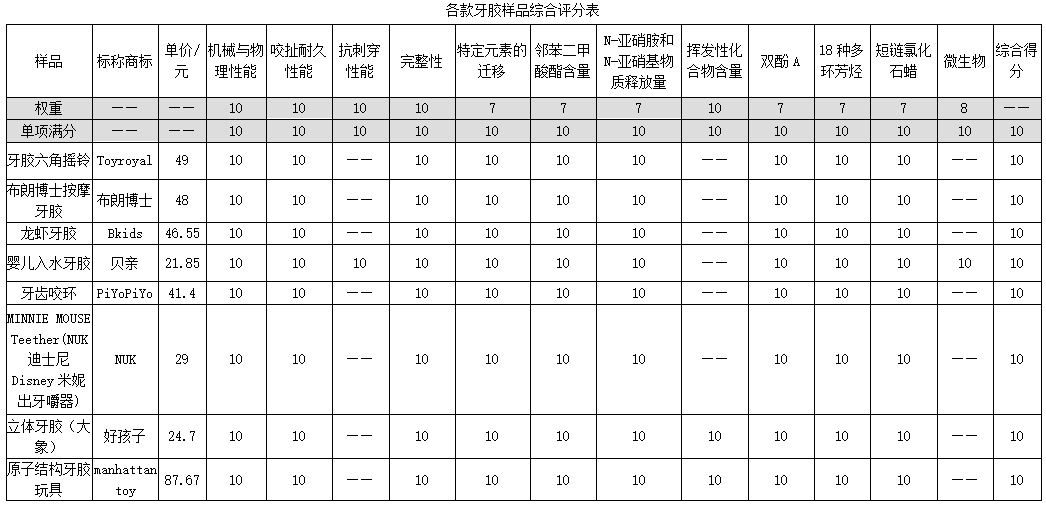 婴幼儿牙胶商品比较试验结果汇总表(详表)