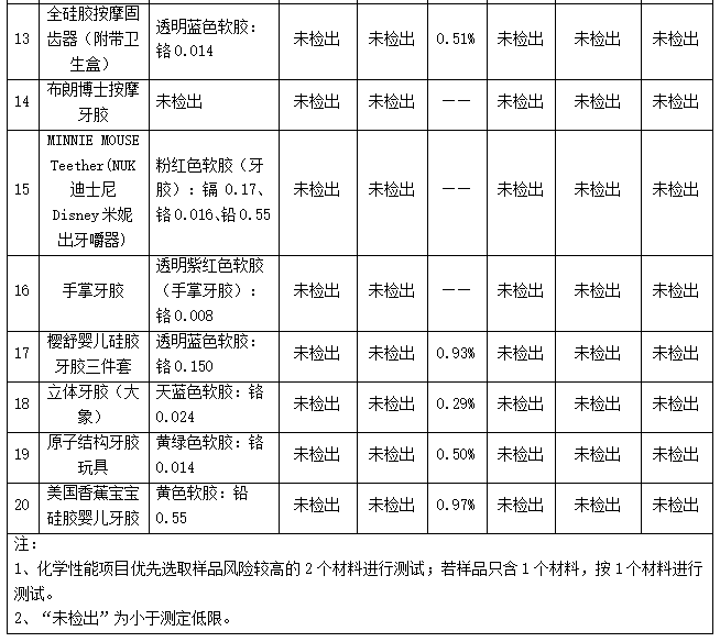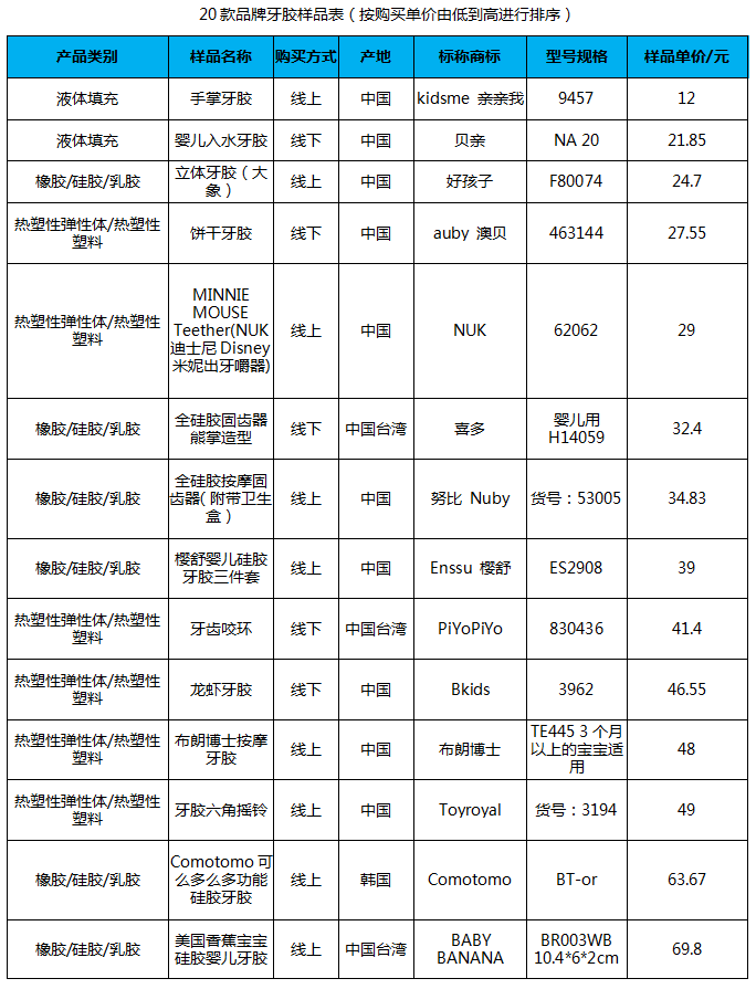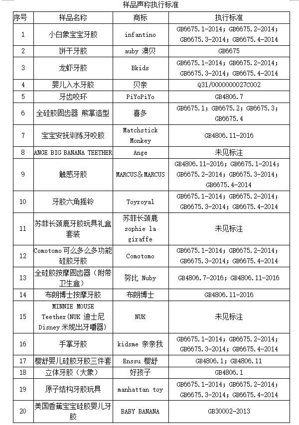 依据《消法》赋予的法定职能,近期广州市消委会委托深圳市计量质量检测研究院开展婴幼儿牙胶商品比较试验,通过对不同品牌牙胶的质量对比,为消费者提供相应的商品信息及消费指导。试验结果仅对测试样品负责,不代表其同一批次或其他型号产品的质量状况。