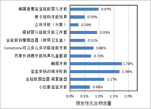 测试结果显示,标称“立体牙胶(大象)”和标称“原子结构牙胶玩具”2款样品的挥发性化合物含量不超过0.5%(m/m),其余9款牙胶产品该项目均超过0.5%(m/m),其中,标称为“触感牙胶”样品挥发性化合物含量最高,为1.78%(m/m),详见下图。挥发性化合物大致是丙酮、丁酮、无水乙醇、乙酸乙酯等化学物质,如果含量超过一定的范围,存在通过口腔、呼吸道迁移入婴幼儿体内的可能。