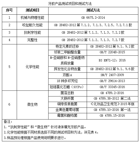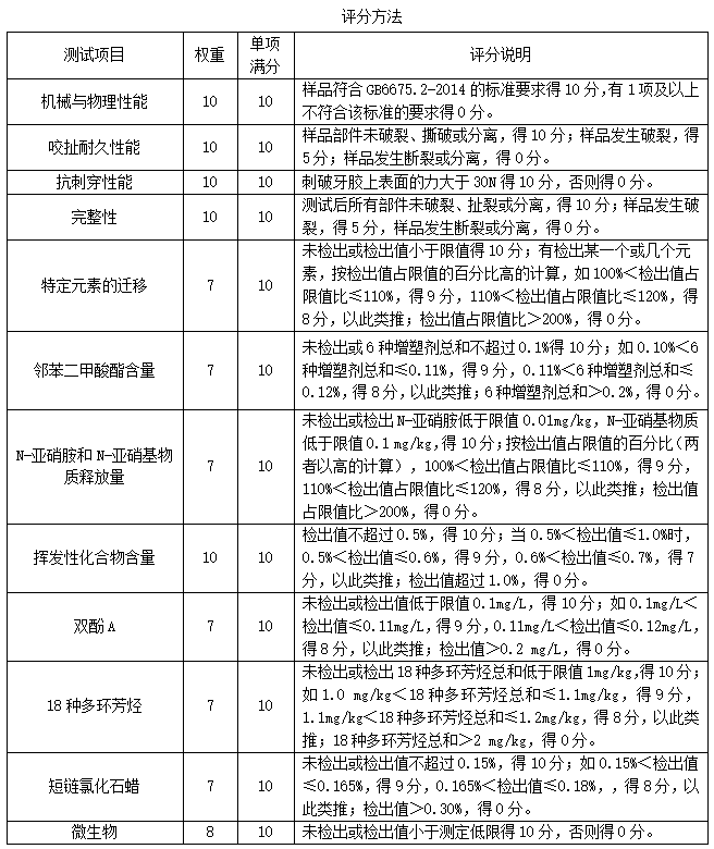 为了更全面的了解婴儿牙胶在结构安全、使用性能以及有毒有害物质等众多方面可能存在的各种情况,本次比较试验一是参照儿童玩具的安全要求、婴幼儿安抚奶嘴安全要求等标准,对牙胶可能被当做玩具使用的情况进行测试以考核牙胶的物理结构安全问题;二是参照婴幼儿安抚奶嘴安全要求、国家食品安全微生物检验要求以及其他测试方法,对牙胶的有毒有害物质(包括化学性能和微生物等)进行测试。