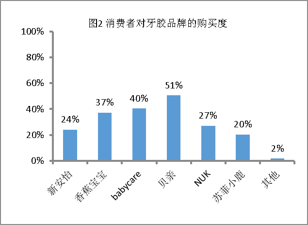 根据广州市消委会前期调查数据显示:消费者在购买牙胶时重点关注商品的柔软度、清洗难度、抓握难度和安全度(是否含有有害物质),对贝亲、香蕉宝宝、babycare、NUK、苏菲小鹿等品牌有一定的购买度。调查统计结果见下图。
