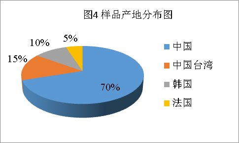 20款样品,产地分别为中国、中国台湾、韩国及法国。样品的产地、价位分布图见下图。