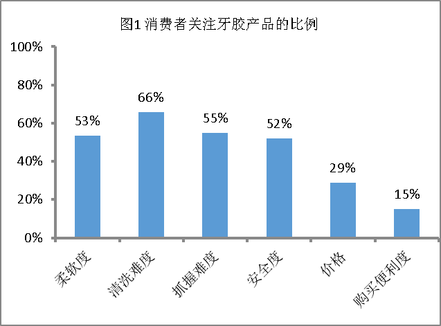 (一)前期调查数据显示,超过半数的消费者关注牙胶的柔软度。一般来说,硅胶、乳胶、热塑性弹性体相对会柔软,而热塑性塑料比较硬。消费者在选购时,可以参考产品的材质,或者用手捏一捏,感受商品的柔软度。