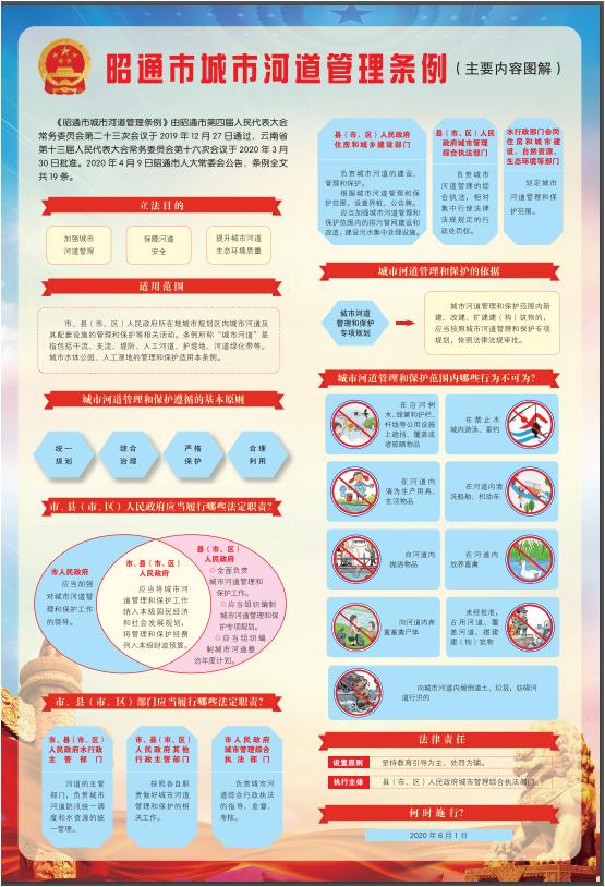 《昭通市城市河道管理条例》的主要内容。《条例》共十九条,主要包括三个方面的内容:一是《条例》的一至四条依次规定了立法目的、法律依据、适用范围、基本原则等内容。条例适用于市、县(市、区)人民政府所在地城市规划区内城市河道及其配套设施的管理和保护等相关活动。城市河道包括干流、支流、堤防、人工河道、护堤地、河道绿化带等,城市水体公园、人工湿地的管理和保护适用本条例。 城市河道管理和保护适当遵循统一规划、综合治理、严格保护、合理利用的原则,严格落实河长制。二是《条例》的五至十四条对市、县(市、区)、乡(镇)人民政府及相关职能部门的城市河道管理和保护职责权限作出界定,强调各职能部门之间的联合协作。规定市人民政府应当加强对城市河道管理和保护工作的领导,县(市、区)人民政府全面负责城市河道管理和保护工作。明确市、县(市、区)人民政府水行政主管部门是河道的主管部门,负责城市河道防汛统一调度和水资源的统一管理;县(市、区)人民政府住房和城乡建设部门负责城市河道的建设、管理和保护;县(市、区)人民政府城市管理综合执法部门负责城市河道管理的综合执法,相对集中行使法律法规规定的行政处罚权。提出了制定城市河道管理和保护专项规划、城市河道整治年度计划以及划定城市河道管理和保护范围的要求。同时,通过建立完善投诉、举报、奖励、处置、反馈、回访等制度机制,鼓励公众主动参与到城市河道管理和保护中。三是《条例》的十五至十八条规定了具体的禁止性行为和相应法律责任。《条例》的禁止性行为规定紧扣昭通实际,注重针对性和可操作性,对常见的上位法未明确规定的影响城市河道管理和保护的行为进行了列举。法律责任部分的行政处罚严格依照上位法处罚幅度和范围设定,体现了“以人为本,教育管理”为主的原则,行为人违反《条例》规定的禁止行为,能责令限期改正、恢复原状的,限期改正、恢复原状;必须处罚的,按违反的行为相对应的处罚条款给予处罚。