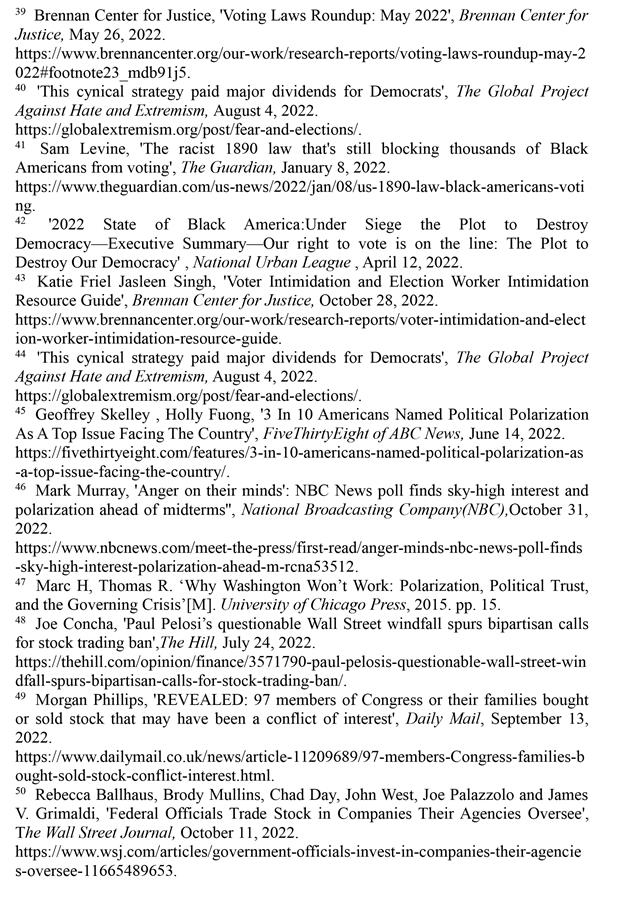 多重手法并用操弄选举结果。“许多美国人完全摒弃了平等的观念,而常常正是由这些摒弃平等观念的人制定他人不得不遵守的规则。”(注38)限制选民投票资格的法律频繁出台。布伦南司法中心2022年5月26日发表的研究指出,2021年美国有18个州通过了34项限制投票的法律。在2022年的立法季,有39个州的立法机关审议了至少393项限制性法案,通过设置一系列投票障碍,极大地制约了有色人种选民行使投票权。亚利桑那州颁布了规制选民登记中提供身份证明文件的法律,多达20万名选民可能面临被取消登记的风险。(注39)“全球反对仇恨和极端主义组织”2022年8月4日发表题为《美国人的恐惧感抑制民主参与》的报告指出,40%的非洲裔和37%的拉美裔美国人担心被剥夺投票权利。(注40)英国《卫报》网站2022年1月8日发表题为《1890年的种族主义法律仍在阻止成千上万的美国黑人投票》的文章指出,严苛的投票资格法律阻止了密西西比州近16%适龄投票的非洲裔美国人进行投票。该州作为非洲裔最集中的地区之一,一个多世纪以来从未选举出一名非洲裔担任公职。(注41)“美国城市联盟”2022年4月12日发布《2022年非洲裔美国人状况报告:摧毁民主的阴谋笼罩之下》指出,过去一年,有20个州利用人口普查数据重新划分选区,剥夺了非洲裔等大量少数族裔选民的投票权。(注42)这些操纵选举的手段变相剥夺了大量选民的投票资格,平等的选举权名存实亡。