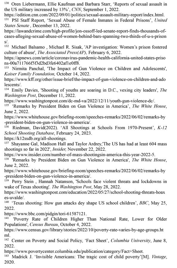 妇女堕胎失去宪法保护,儿童生存环境令人担忧。美国联邦最高法院推翻“罗伊诉韦德案”的裁决终结了近50年来受宪法保护的堕胎权,是对妇女人权和性别平等的巨大打击。2022年美国有超过5800名18岁以下的儿童因枪击受伤或死亡,校园枪击事件数量高达302起,创1970年以来的最高值。美国儿童贫困率从2021年12月的12.1%上升至2022年5月的16.6%,增加了330万贫困儿童。2018年以来被非法雇用的童工激增近70%,2022财年受雇专门从事危险工作的儿童增加了26%。