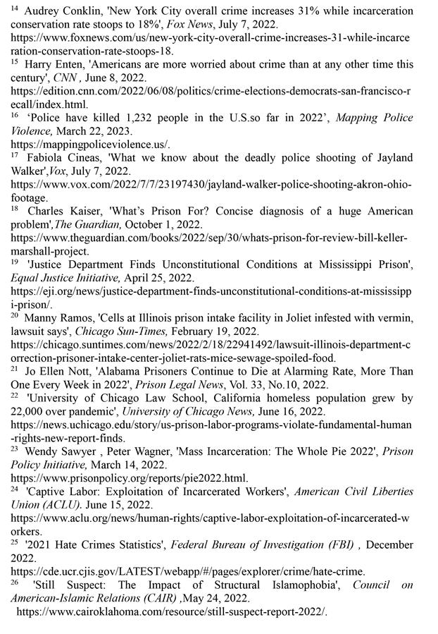 执法司法领域种族歧视根深蒂固。联合国消除种族歧视委员会的结论性报告指出,美国执法人员对有色人种和少数族裔群体过度使用暴力并逍遥法外的情况仍然普遍存在;有色人种和少数族裔在美国司法系统中被逮捕、监禁和长期虐待的情况突出。(注73)“警察暴力地图”网站的数据显示,在2013年至2022年的警察杀人事件中,非洲裔被警察杀害的可能性是白人的2.78倍,手无寸铁的非洲裔被警察杀害的可能性是手无寸铁的白人的1.3倍。在波士顿、明尼阿波利斯和芝加哥,非洲裔被警察杀害的可能性更是白人的20多倍。(注74)美国国家公共电台2022年9月27日报道,国家免责登记处发布的报告指出,非洲裔在美国人口中所占比例不到14%,但在美国被误判犯有严重罪行并在至少服完部分刑期后获释的所有人中,非洲裔占了53%;美国非洲裔因三项重大罪行被错误定罪的可能性是白人的7倍,非洲裔因毒品犯罪被错误定罪的可能性是其他人的19倍。(注75)美国国家学院出版的《美国监禁的增长:探索原因和后果》一书指出,渗透着种族主义的刑事司法系统“正日益成为一个更大的污名化和长期边缘化系统的主要通道”。(注76)