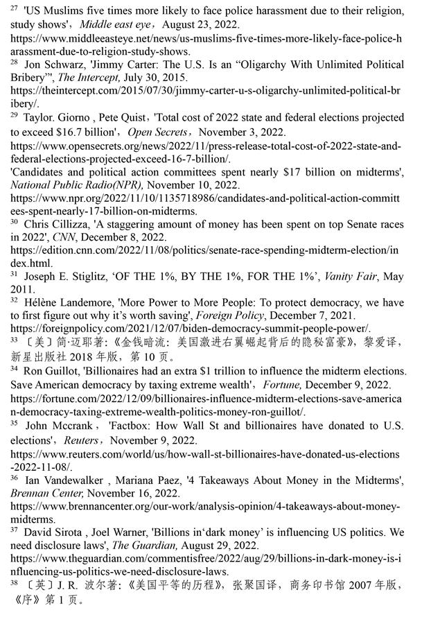 政治献金缔造寡头政治。美国政治被资本绑架,存在稳定的“金钱-回报”关系,“民有、民治、民享”变成了“1%的人所有、1%的人治理、1%的人享用”,正如“占领华尔街运动”的标语所示:“我们是99%的民众,但被1%的人所控制”。(注31)耶鲁大学政治学教授海伦·兰德摩尔2021年12月在《外交政策》发表文章指出,美国的民主“缺少了真正来自人民的力量”。(注32)“占人口极小部分的极富阶层可以利用极高的经济地位来推动一套政策优先服务于他们。”(注33)《财富》杂志网站2022年12月9日发表题为《亿万富翁有额外的万亿美元来影响中期选举》的文章指出,截至10月底,美国亿万富翁在选举中的花费高达8.8亿美元,最终总额可能接近10亿美元,亿万富翁正以前所未有的方式提供选举资金。美国税收公平组织执行董事弗兰克·克莱门特表示,亿万富翁的财富一直在“淹没我们的民主”。(注34)路透社2022年11月9日报道,自2021年1月1日至2022年9月30日,美国亿万富翁的政治献金占所有联邦政治项目献金的15%,远高于2020年选举周期的11%。美国富豪乔治·索罗斯是出资最高的个人捐赠者,其政治献金超过1.28亿美元。(注35)富豪以金钱开路,操控选举结果,美式选举越来越背离民主的本质。