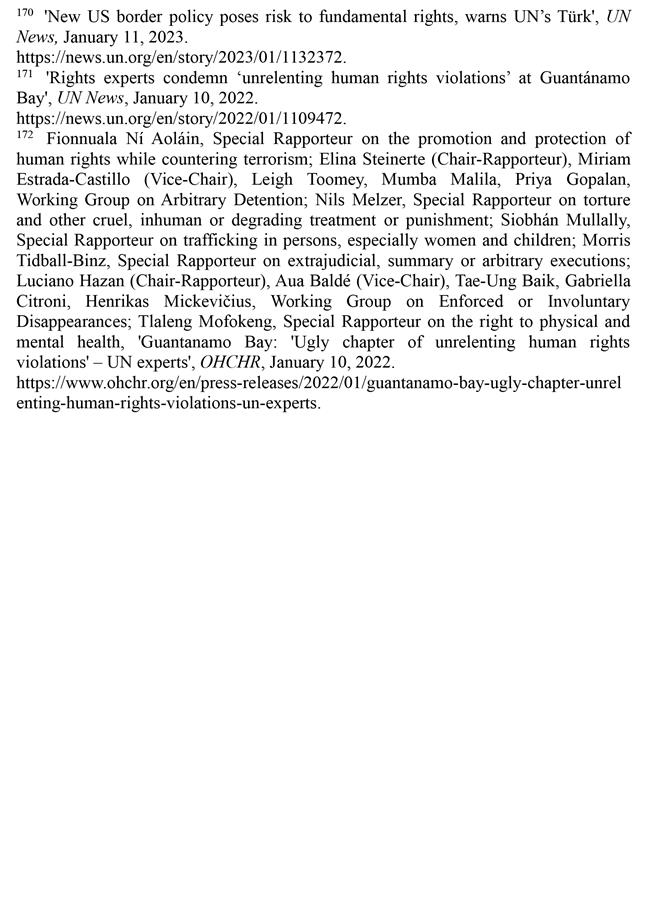 拒不关闭关塔那摩监狱。2002年设立的关塔那摩监狱最多时曾关押约780人,其中大多数人未经审判便遭拘留,受到了残忍的、不人道的待遇,是美国“肆意侵犯人权的一个丑陋篇章”。(注171)联合国人权理事会在反恐中促进和保障人权问题特别报告员菲奥努阿拉·尼奥莱因等多名独立专家2022年1月发表共同声明指出,臭名昭著的关塔那摩监狱是美国在人权保护上的污点,要求美国政府关闭关塔那摩监狱,对遭受酷刑、任意拘留的公民进行赔偿,并根据国际法追究授权和实施酷刑的人员的责任。(注172)
