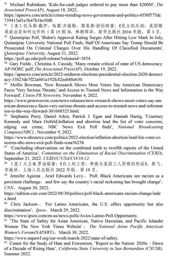 民众对美国民主的信心持续走低。美国学者托马斯·戴伊、哈蒙·齐格勒和路易斯·舒伯特合著的《民主的反讽:美国精英政治是如何运作的》一书指出:“现在美国民众基本上不再相信政府是为大众利益服务的,大部分人都认为美国政治制度由少数大型利益集团操控,且往往是为了他们自己的利益而把大众抛在脑后。”(注52)“美国昆尼皮亚克大学民意调查”2022年8月31日发表调查报告指出,67%的美国人认为美国民主面临“崩溃风险”。(注53)美联社2022年10月19日报道,几十年来,美国全国范围内的两极分化日益加剧,人们对民主普遍感到绝望。只有9%的美国成年人认为民主正在“极好”或“非常好”地运作,而52%的人认为它运作不佳。(注54)美通社2022年11月4日报道,中期选举前的一项无党派民意调查显示,86%的选民表示美国民主面临“非常严重的威胁”。72%的选民认为美国民主不健康,64%的选民认为太多金钱介入政治,61%的选民认为美国政治腐败,58%的选民认为美国民主政治存在太多带有偏见或错误的信息。(注55)美国全国广播公司新闻网2022年11月9日发布的调查结果显示,72%的民主党选民、68%的共和党选民和70%的中间选民都认为民主受到了威胁。(注56)民众对美国民主的信心持续走低,折射出美式民主正在失去民意基础。
