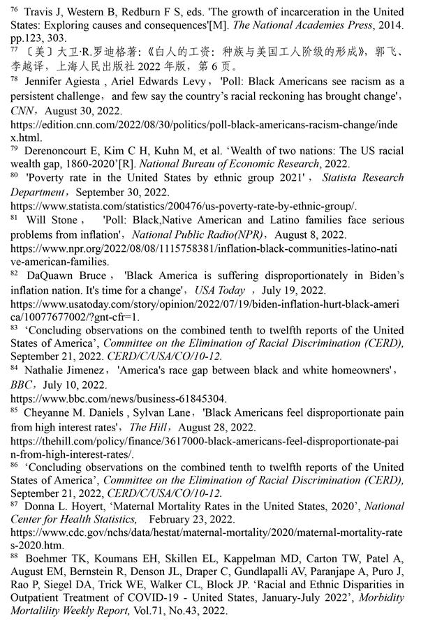联合国消除种族歧视委员会2022年9月21日发布的关于审议美国履行《消除一切形式种族歧视国际公约》情况的结论性报告指出,美国历史上殖民主义和奴隶制留下的阴影至今仍挥之不去,助长着美国社会流行的种族主义。近几年来,美国仇恨犯罪和仇恨言论事件显著增加,与种族有关的枪支死伤人数大幅增加,有色人种和少数族裔在医疗、教育、住房等领域持续面临系统性歧视。(注57)