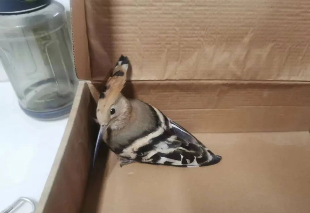 当天下午,市民抱着一只鸟走进黄河路派出所求助,称其发现该鸟落在自家院内无法飞行。值班民警对鸟的外形进行了初步检查,发现该鸟左翅有明显外伤,将其放在纸箱内临时安置。随后,派出所民警向森林警察大队民警讲述情况,大队民警立即赶往派出所进行救助,经大队民警观察确认此鸟外貌特征,发现其头顶具凤冠状羽冠,嘴形细长,该动物为国家二级保护动物戴胜鸟,一般栖息于山地、森林、河谷、果园等开阔地方,森林警察大队民警立即把受伤的野生动物送往格尔木市野生动物救助站进行及时救治,待有放生条件时将其放归大自然。