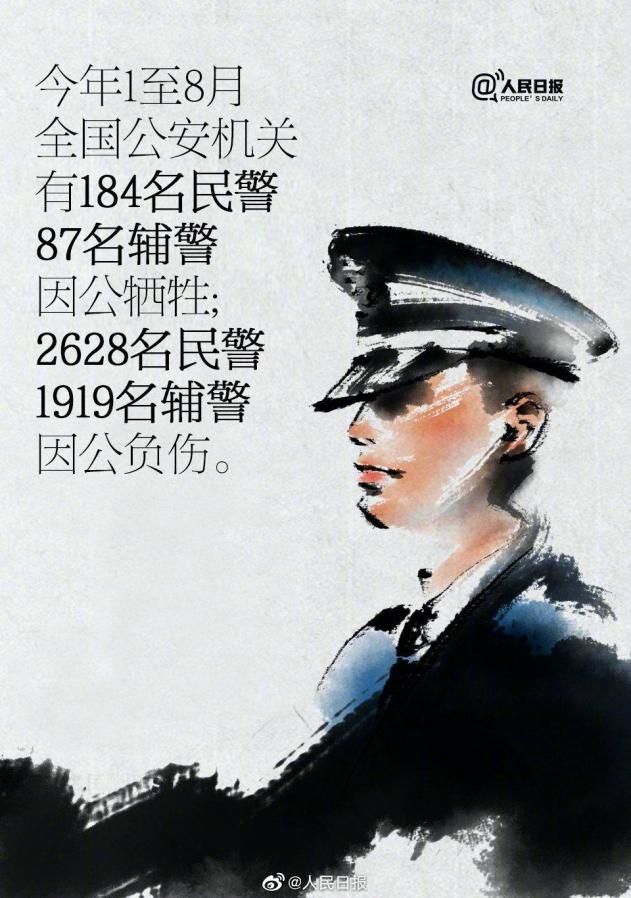 2.愿不再增长!1到8月184名民警87名辅警因公牺牲:党的十八大以来,全国公安机关共有3700余名民警牺牲在他们所热爱、奋斗、奉献的公安事业上。今年1至8月,全国公安机关又有184名民警、87名辅警因公牺牲,2628名民警、1919名辅警因公负伤。致敬负重前行的人民警察!(人民日报)
