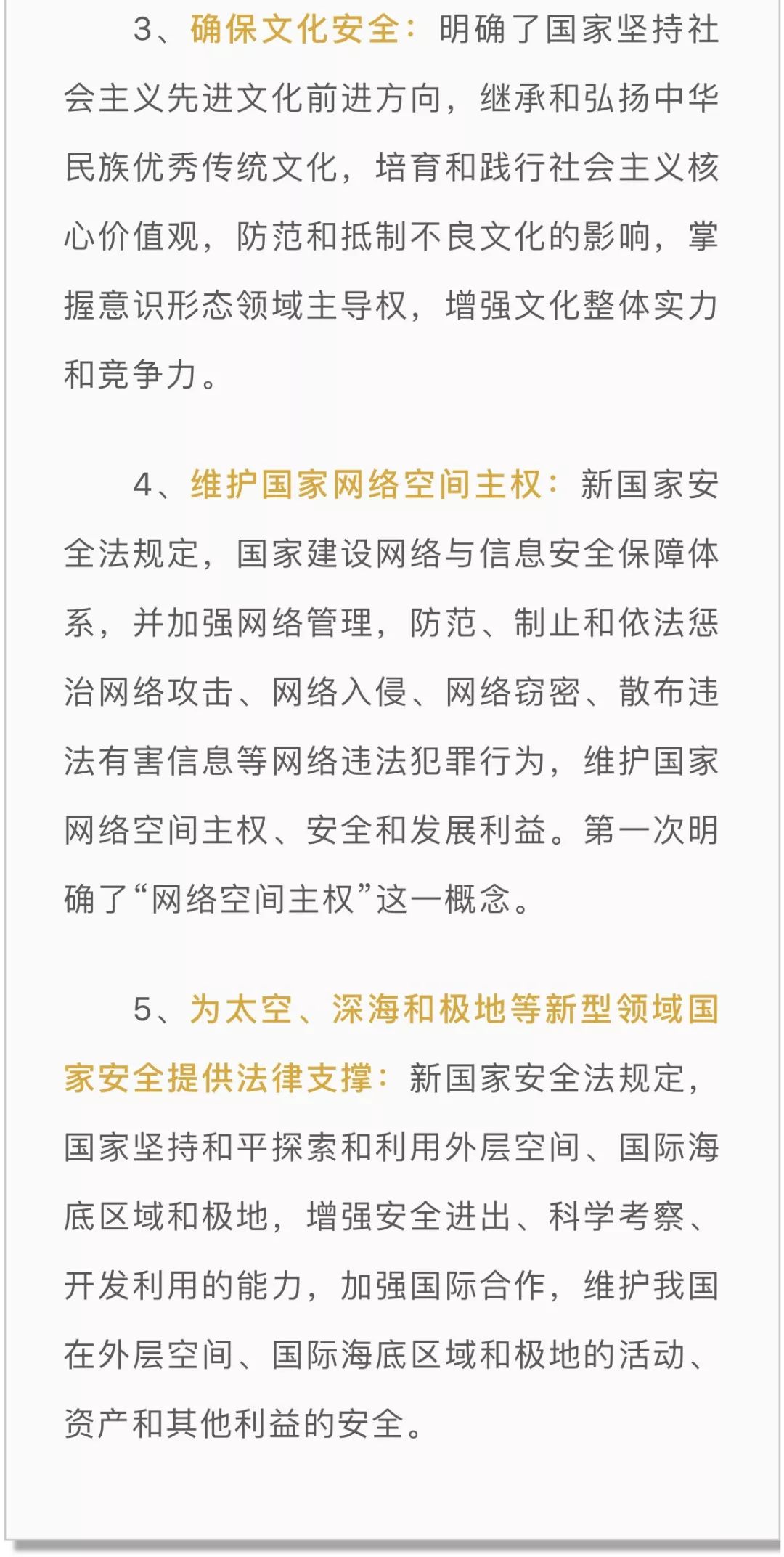 为了体现总体国家安全观的要求,《中华人民共和国国家安全法》从政治安全、国土安全、军事安全、经济安全、文化安全、社会安全、科技安全、信息安全、生态安全、资源安全、核安全等11个领域对国家安全任务进行了明确。