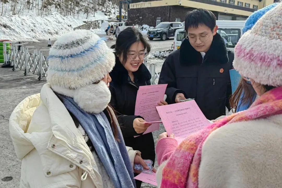 活动中,“普法小分队”主动走进店铺、走近游客,开展“面对面”普法宣传,向过往的游客及商家发放《消费者权益保护法》《旅游法》、滑雪注意事项等宣传手册,解读相关法律法规,并耐心解答法律咨询,了解排查游客近期是否存在权益受到侵害的问题,介绍景区沿途设置的法官工作站,提醒广大游客提高法律意识,增强法治观念,旅游过程中遇到涉旅纠纷可就近在驻山服务站寻求帮助。同时,还为游客发放暖心小礼物,“掰掰热暖宝宝”让游客在冬季的寒冷中感受司法为民的温度,受到游客及群众的广泛欢迎。