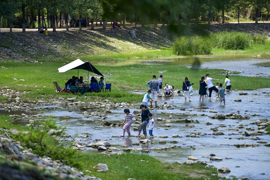 2024年7月6日,山东济南,游人沿溪流露营享受清凉一“夏”。视觉中国供图