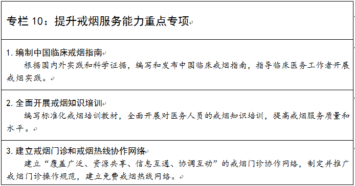1.健全戒烟服务体系。鼓励医院设立规范的戒烟门诊,提供临床戒烟服务。加强戒烟服务公共设施建设,建立覆盖全国的戒烟门诊协作网络,加强合作交流,推动资源共享。建立免费的戒烟热线,提供简便可行的戒烟建议和各种戒烟服务信息。