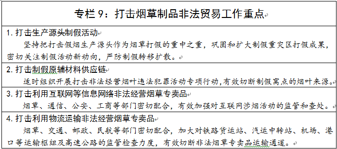 1.巩固完善联合打假打私机制。加强烟草、公安、海关、司法、工商、质检等部门协调配合和地区之间相互支持,共同打击烟草制假、售假、走私等各种违法犯罪行为。对收缴的走私烟、假烟实施销毁,防止流入市场。加强国际及港澳特区合作,有效打击跨国、跨境烟草制品非法贸易活动。