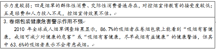 3.提高健康危害警示效果。按照“大而明确、醒目和清晰”的要求,通过扩大警语占用面积、加大警语字体、增强颜色对比度等,切实提高烟草危害警示效果。逐步实施卷烟包装印制戒烟服务热线等相关信息,积极提供戒烟咨询和帮助。